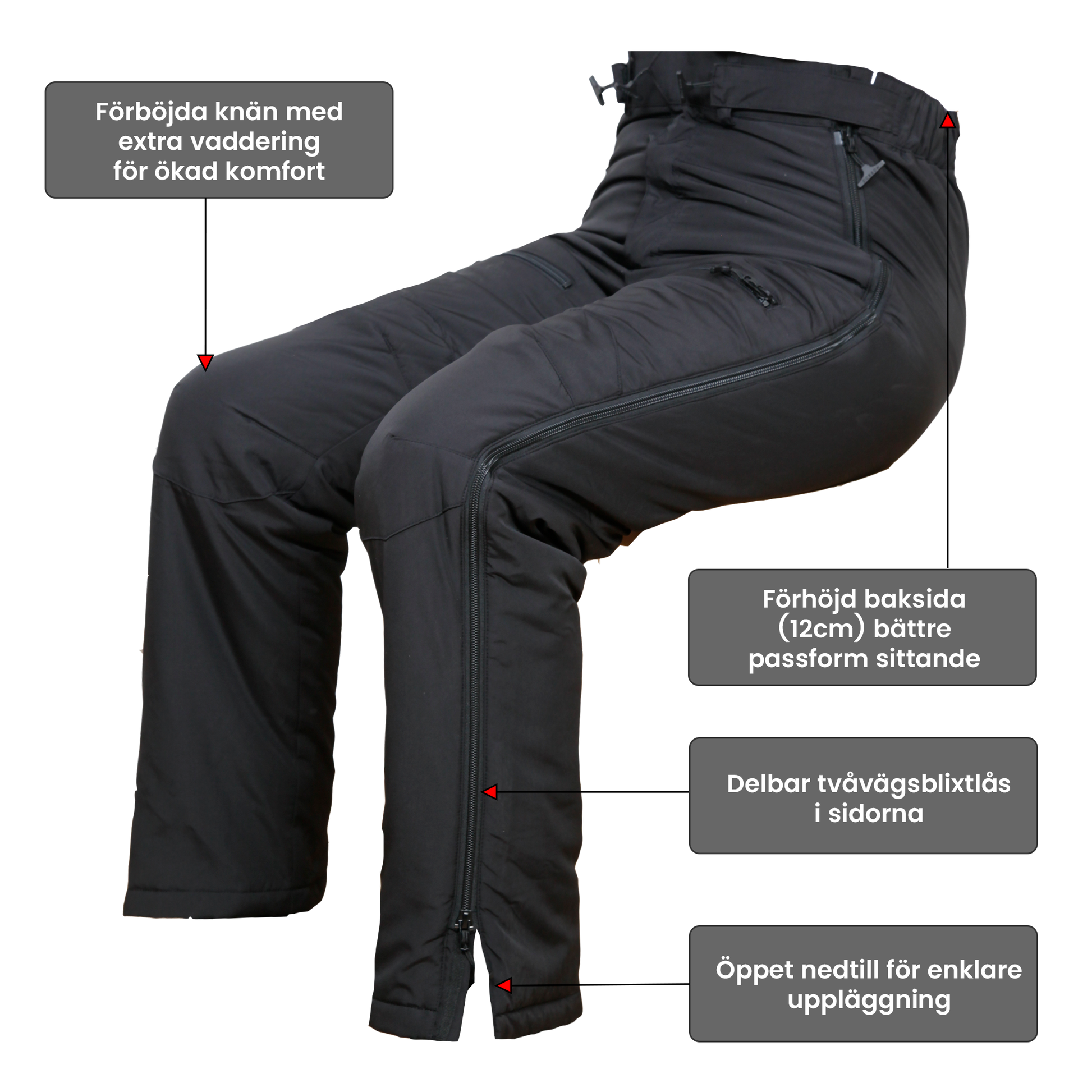 Alla dragkedjor är försedda med vår speciellt framtagna T-zippuller, som gör dem enklare att greppa och underlättar öppning och stängning. Byxan har en förhöjd rygg som är 12 cm högre än på en vanlig byxa, vilket ger extra komfort – särskilt för personer i rullstol.